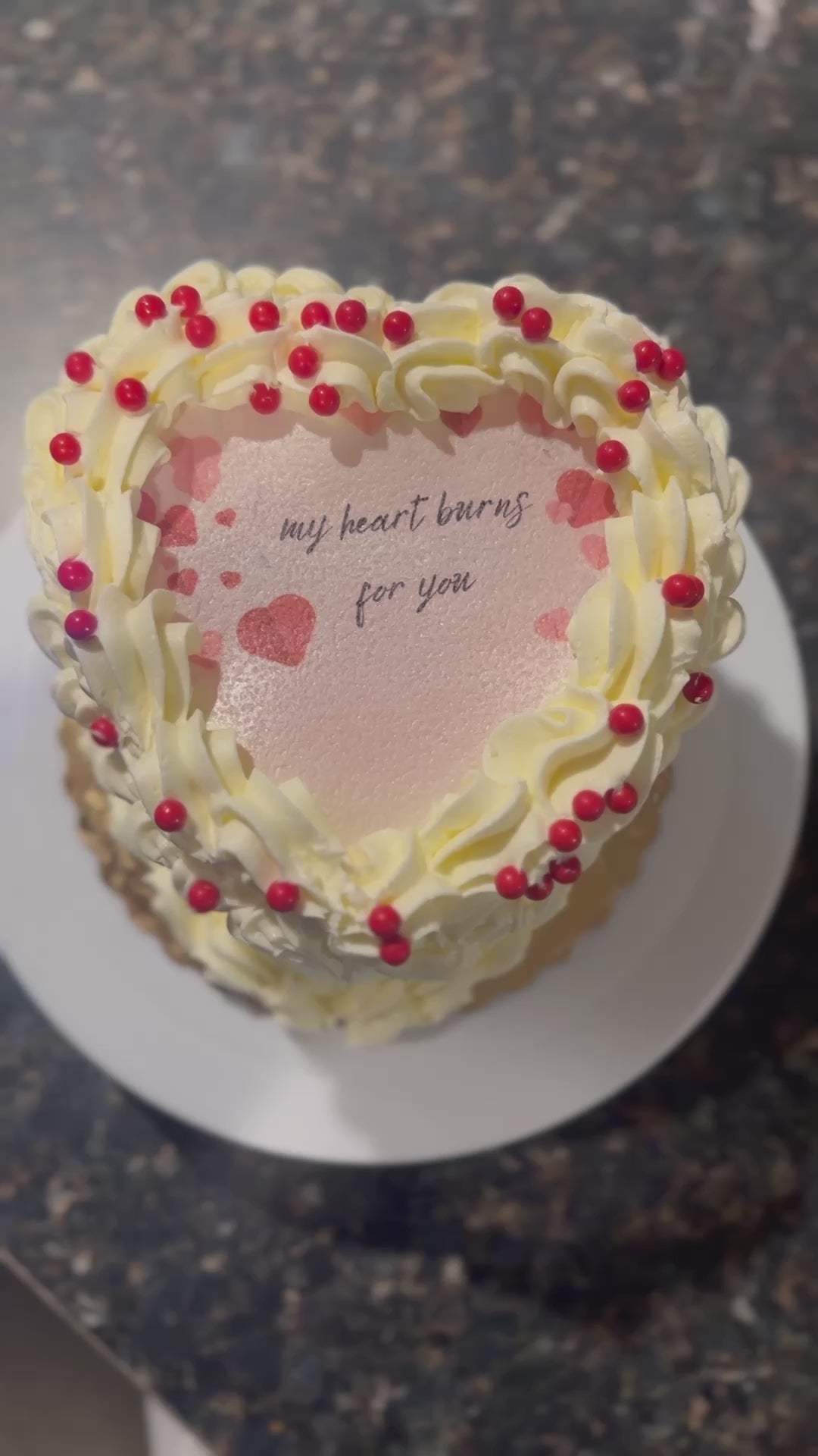 Satisfy your love and sweet tooth with this adorable, delicious burning heart cake. This cake is 6" heart shaped cake and 5' high, 2 thick layers and your choice of flavor, with 2 edible images. One image to burn and one with your very special message or picture.